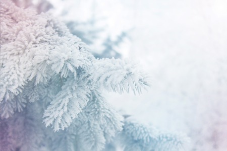 Winter background - frosty fir branch. Closeup view of light blue tree branch in white snow. Blue color filter added.