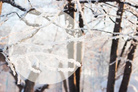 A branch of a tree snow covered with snow on a winter day. Sunny winter day. Frost on a wooden branch.