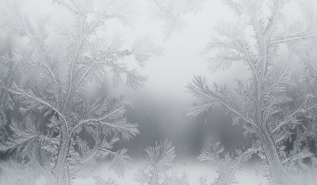Delicate frost crystals cover a window, showcasing beautiful patterns against a serene, blurred winter landscape. The scene evokes a sense of chilly tranquility and winter magic.