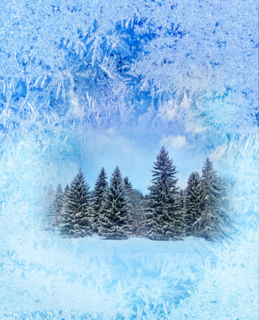 frozen window and behind it a winter forest