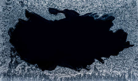 Frost patterns on frozen winter window as a symbol of Christmas wonder. In the middle of the window is a misted space for your product or lettering. Christmas or New year background.