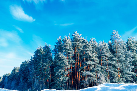 Frozen winter forest with snow covered trees. outdoor