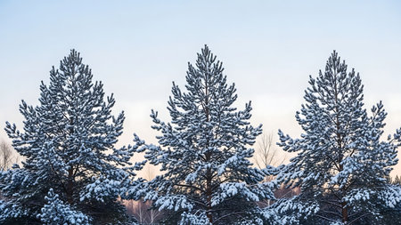 Snow covered pine trees stand tall against a pale winter sky during a serene frosty morning