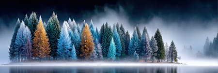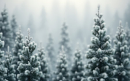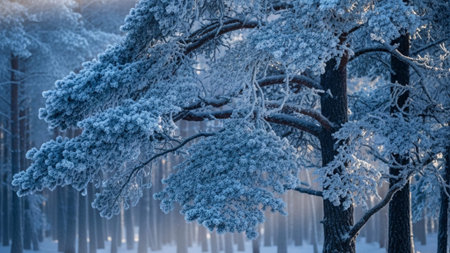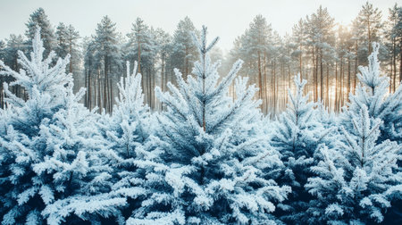Evergreen trees blanketed in frost create a tranquil winter scene, surrounded by mist and soft light, showcasing the beauty of nature's winter landscape