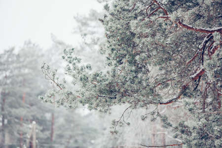 Pine branch in frost. Winter Christmas forest.