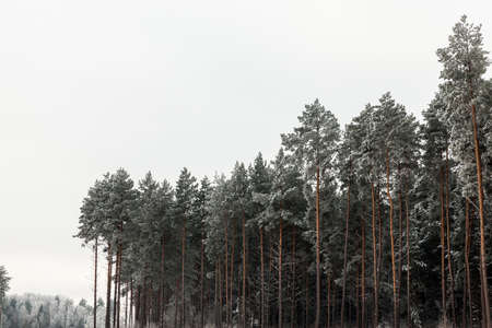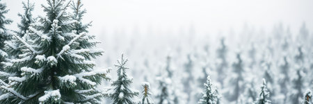 pine trees forest covered with snow on white sky background, panoramic shot