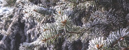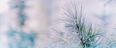 frozen pine branch close-up. frost on plants. winter landscape: snow in nature. Needles in frost. Christmas tree