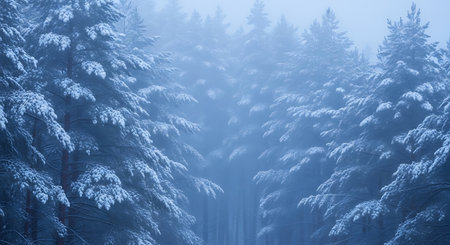 Dense winter forest with snow-covered pine trees shrouded in misty fog, creating an ethereal blue-toned landscape.