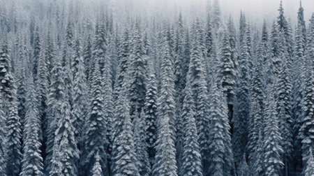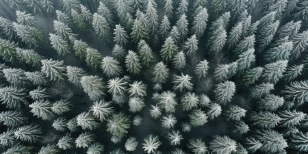 Aerial view showcases a dense forest of fir trees blanketed in snow, capturing the tranquil beauty of winter. Soft light filters through the treetops, enhancing the peaceful scene.