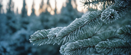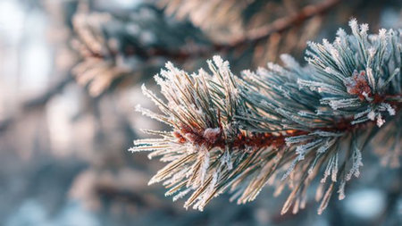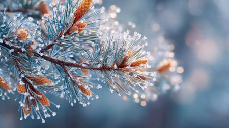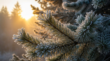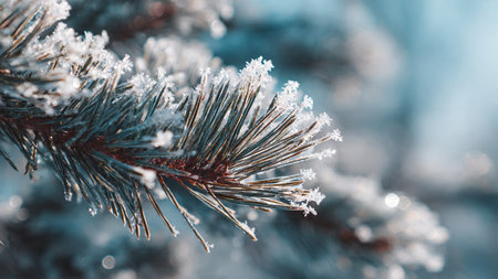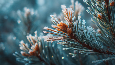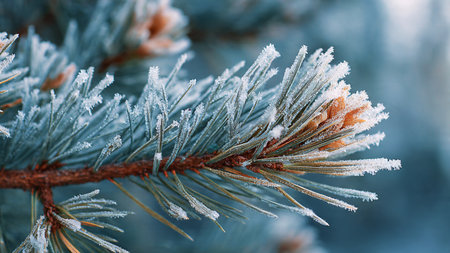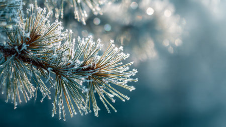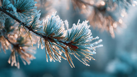A close-up view of a frosty pine branch adorned with sparkling ice crystals, captured in soft morning light, highlighting the beauty of winter nature.