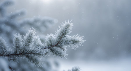A branch of a snow-covered pine tree with space for text. The frosty needles glisten softly, creating a serene winter atmosphere. The open composition is perfect for adding messages or seasonal greetings.