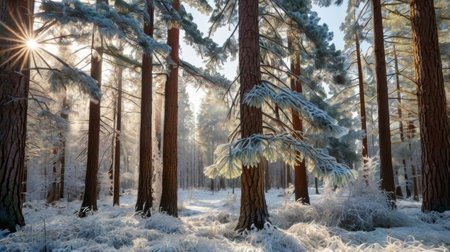 A breathtaking sunrise casts a golden glow over a snow-covered forest, creating a magical winter scene. Tall pine trees stand tall, their branches laden with fresh powder, as sunlight pierces through the misty air.