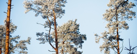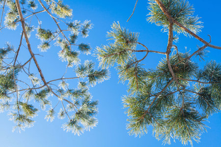 pine tree branches covered with frost with blue sky