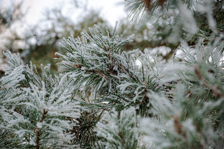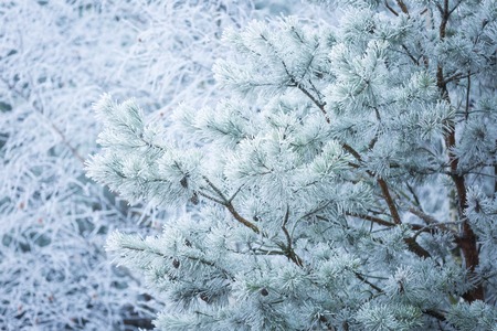 Pine branches covered with hoarfrost on a blurred background.