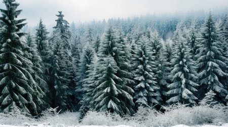 Generative AI, Misty winter fir forest beautiful landscape in hipster vintage retro style, evergreen trees with show