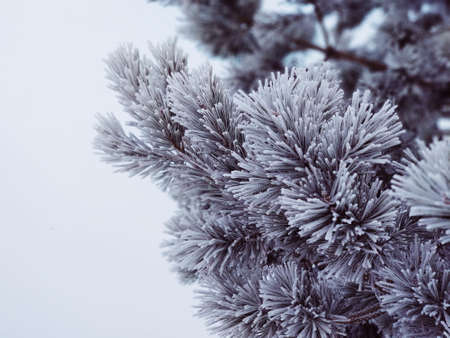 Pine branch covered with hoarfrost. Winter background. Close-up.