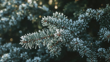 Close-up view of pine needles covered in sparkling frost, illuminated by soft winter light.