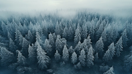 Aerial view of a forest covered with snow and fog in winter
