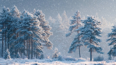 Serene Winter Tranquility with Tall Evergreen Trees Under a Cool Icy Sky in a Snowy Landscape