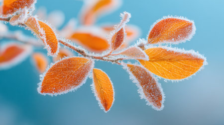 Delicate orange leaves clinging to a branch, covered in frost. The background features a serene blue sky, showcasing a peaceful winter morning atmosphere.