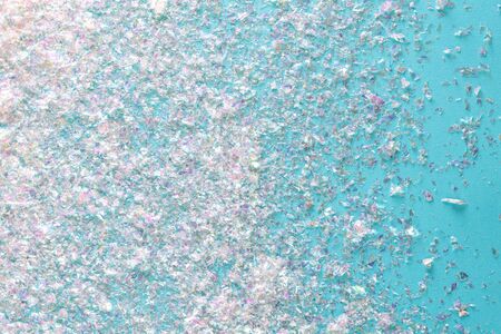 Abstract shining glitters teal makeup background. Blurred multicolored tinsel, selective focus with shallow depth of field. Glisten foil backdrop, christmas magic , eyeshadow closeup concept