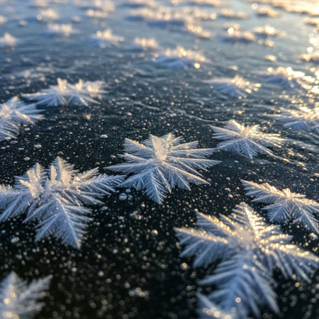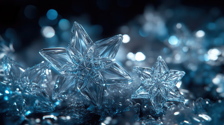 Large, intricate icy crystals form beautiful stars and snowflakes, adding a festive touch to the winter atmosphere.