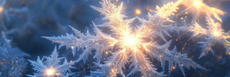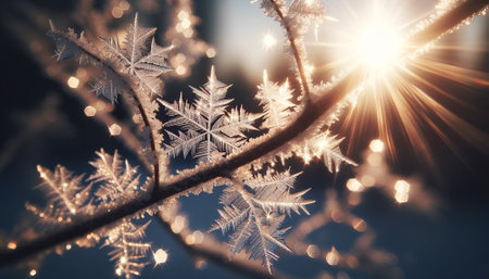 Frosty snowflakes glisten in the dawn light, forming an enchanting winter view filled with intricate crystal patterns and serene colors.