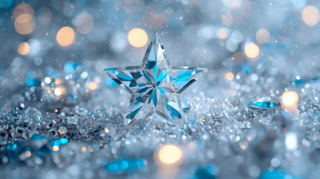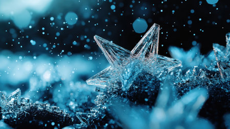 A delicate crystal star rests atop a bed of icy formations, surrounded by shimmering water droplets and reflecting a serene blue hue, evoking a magical winter atmosphere.