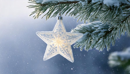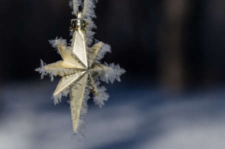 Golden Frost Covered Christmas Star Decorating an Outdoor Tree