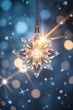 Intricate snowflake-like shapes sparkle in a winter setting, illuminated by gentle lights creating a magical atmosphere.