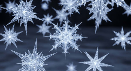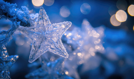 Large icy crystals form traditional Christmas decorations resembling stars and snowflakes, enhancing the winter atmosphere beautifully.