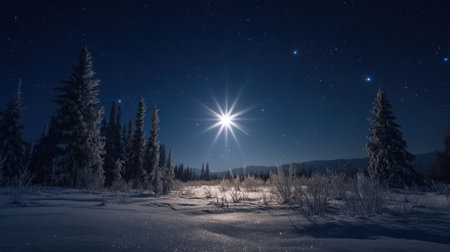 A breathtaking nighttime scene depicting a bright star shinning over a tranquil snow-covered landscape, surrounded by frosty trees under a clear starry sky.