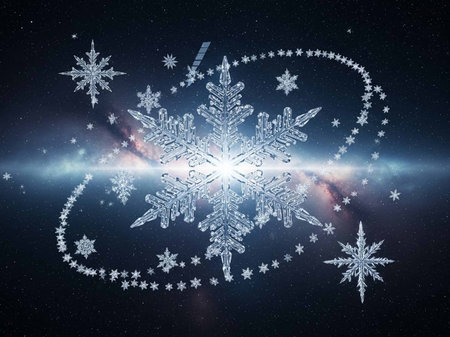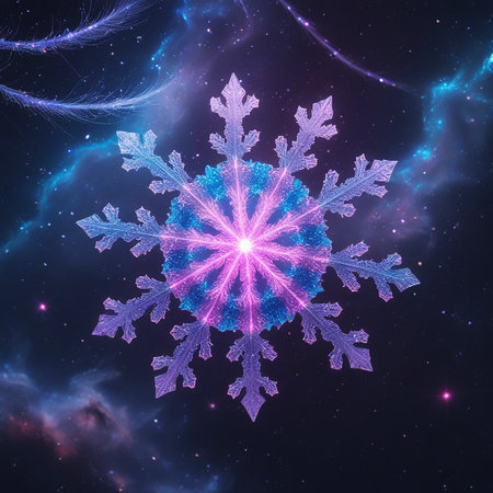 A detailed snowflake with a bright blue and pink center is suspended in a dark, star-speckled cosmic environment with nebulae.