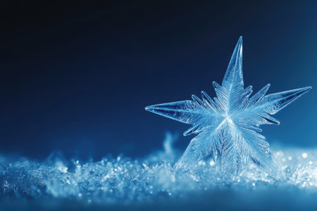 Intricate snowflake design glimmers against a snowy landscape, reflecting soft blue light in winter.