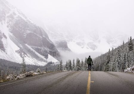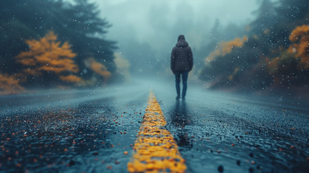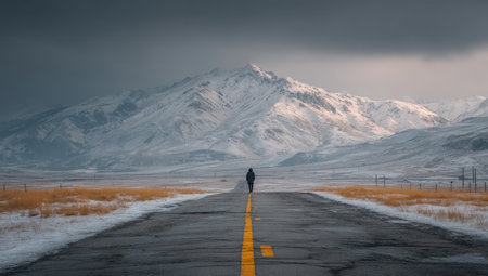 A solitary person walks along a road leading towards a mountain range. The scene features cold tones, with the road highlighted by a yellow line. This image showcases a vast outdoor landscape and may be suitable for travel, editorial, or conceptual applications.