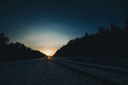 Empty railroad in winter forest at sunset. Dark silhouettes of trees in backlight of dawn. Railway track in golden sunlight. Gold sunbeams. Rails on snow in sun rays. Wonderful atmospheric landscape.