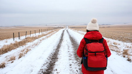 Generative AI Image of Back View of Female Wearing Jacket in Field in Snow Winter Season