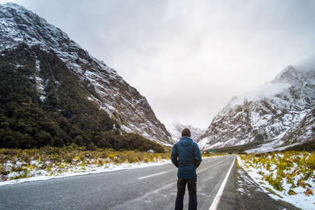 A person stands on a road, facing a mountain range under a cloudy sky. The image displays cool tones, with a vast landscape of yellow-brown fields and snow-capped peaks. The composition emphasizes depth, with a solitary figure. Suitable for various editorial and commercial projects that require dramatic visual.