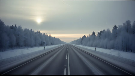As the sun dips below the horizon the stark beauty of a snowcovered highway is highlighted by the golden light peeking through the . AI generation