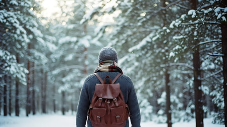 A woman wearing a hat and backpack in a snowy forest, hiking and traveling by foot, adventure concept.