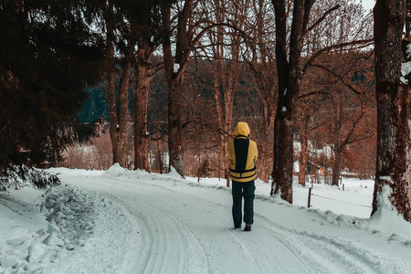 Young man walking in winter czech landscape on forest path in yellow jacket