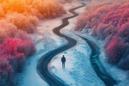 A person standing on a snowy road surrounded by trees, with a soft sunrise in the background, evoking a sense of solitude and tranquility