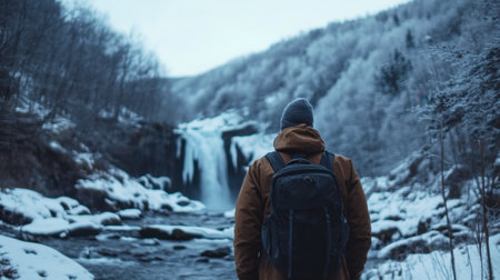 A person gazes at a stunning waterfall cascading down rocky terrain, surrounded by frost-covered trees, capturing the beauty of winter. The atmosphere is serene and tranquil.