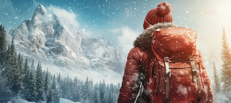 Adventurous Hiker Navigating Through Majestic Snowy Mountains with Breathtaking Scenic Views Ahead