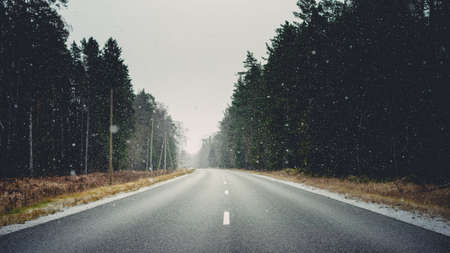 Car driving in heavy snow on highway road in pine forest at Banff national park