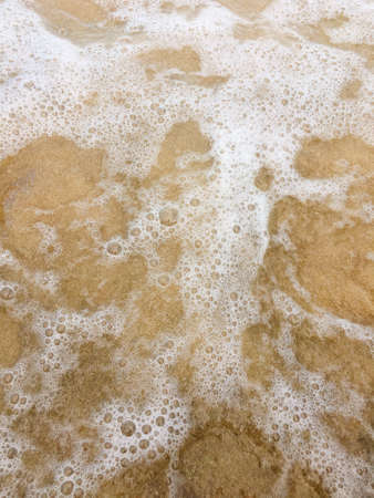 A wave of foam with bubbles of different sizes on a sandy-colored background