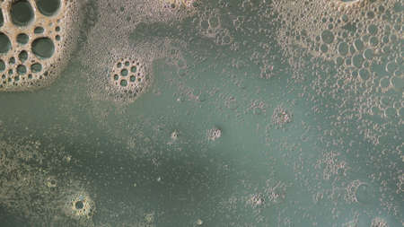 A Foamy bubbles create textured surface in close up view of liquid