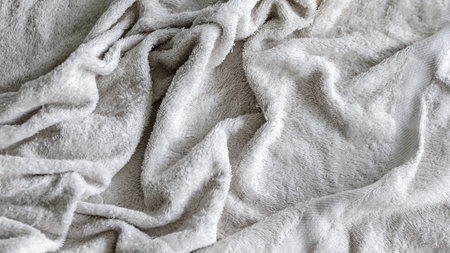 White towel texture. Fluffy carpet background. Blank bathroom textile. Warm sweater material. Soft baby fabric. Grey flat surface. Home expensive design