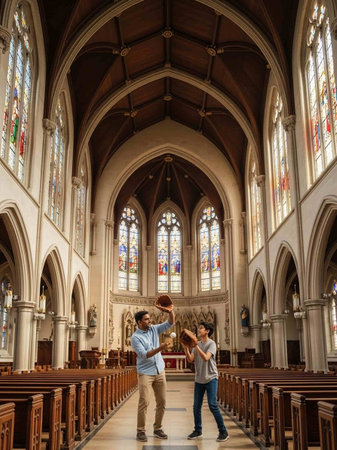 Two men are playing with a baseball and mitts in the aisle of a beautiful Gothic-style church with high ceilings, stained glass windows, and wooden pews.