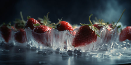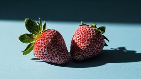 Two ripe red strawberries covered in frost sit on a blue surface with dramatic lighting and shadows.